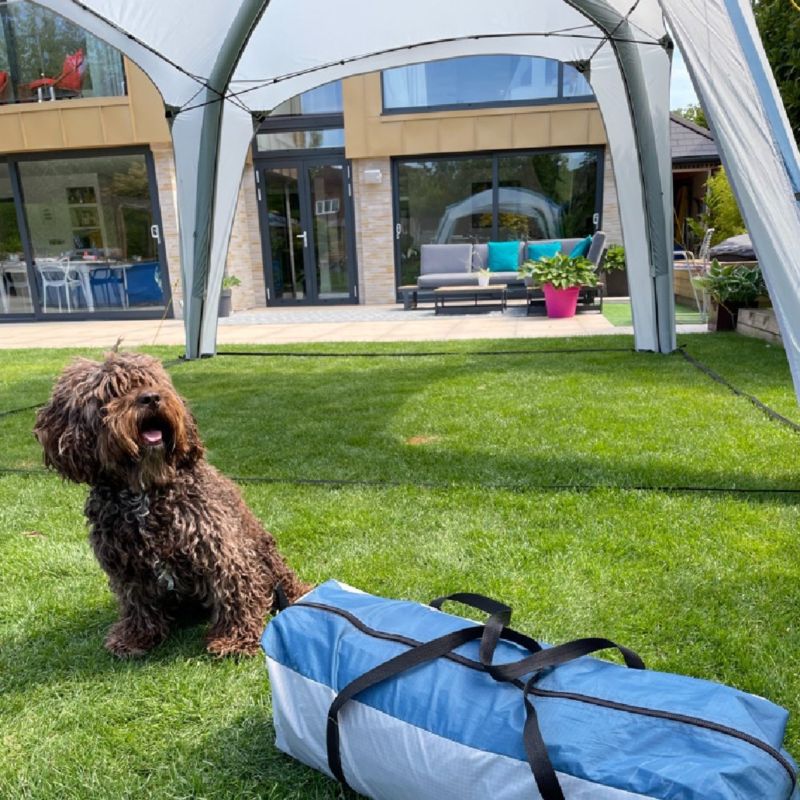 Guy lines, tent pegs and carry bag included - dog not included